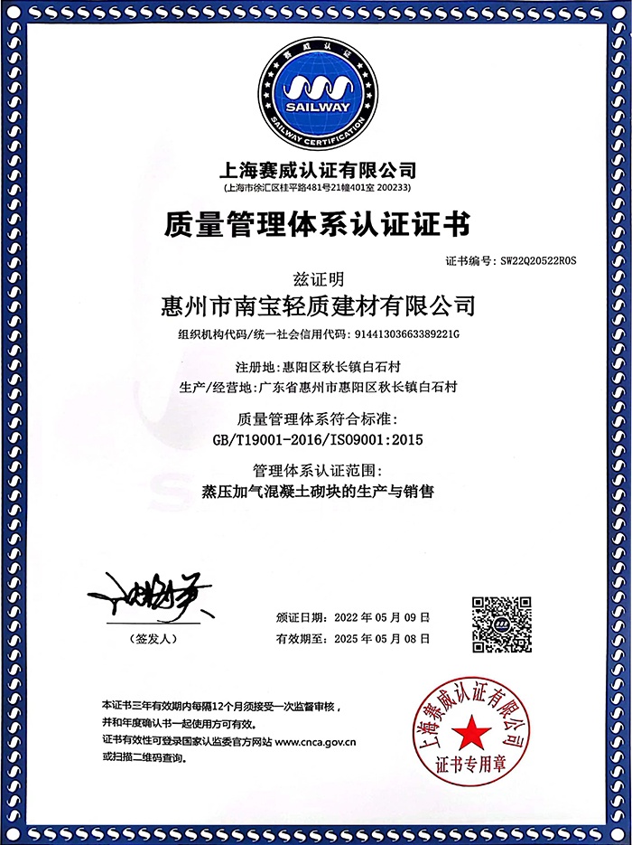 廣東省惠州市南寶輕質建材有限公司成立于2007年,公司一直致力于新型環保的墻體材料的開發、生產和銷售服務,生產的蒸壓加氣混凝土砌塊遍布惠州、深圳及周邊城市,以高品質、高性價比的產品和優良的服務質量榮獲良好的行業口碑,公司于2020年再接再勵,投入3000余萬資金引進行業領先的6米全自動加氣混凝土砌塊生產線,具備年產量40萬方加氣混凝土砌塊的產能,同時使產品品質、性能更加優越。